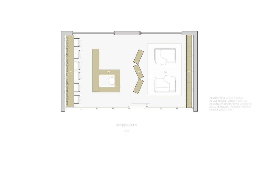 None or very few personnel would be staffed as all is self-service. In enabling an ideal movement of users in such a small space, we fascinated a flexible layout with three functional zones located in the center, while passage ways around those zones are all interconnected, thus creating a fluent ‘8’ form flow, completing an uninterrupted circulation. Meanwhile, this particular layout also uplifts spatial openness and maximizes visual connection between inside of the building and outside city skyline, creating both mind and visual escape that a book café designates.