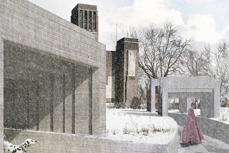 Rough surface concrete is chosen for the portals because that is the most grounded and humble material that we think resonates with the commemoration. Also, the saturated grayish tone conveys slight soberness and is in conversation with the existing memorial wall and building, without distorting the whole image thus blending new and old.