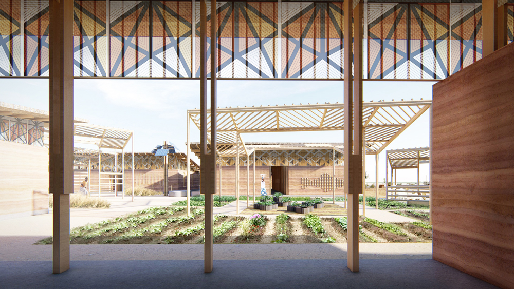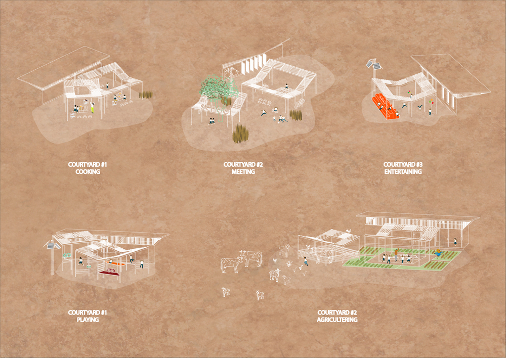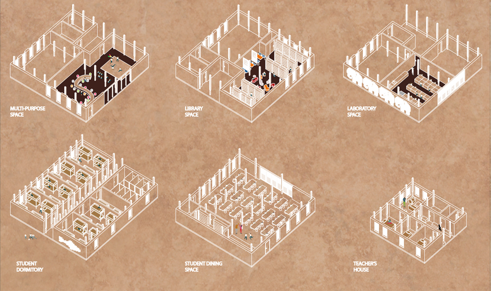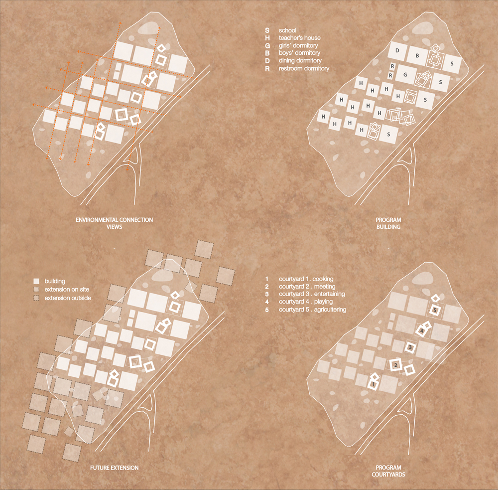 The school campus is designed into 3 types of modules representing the school, teacher houses, and student dormitories that are carefully distributed in a zigzagging layout. This configuration creates a sequence of courtyards, each with its own unique features. A courtyard for cooking, meeting, entertainment, playing, and gardening. Interesting vistas of the surrounding nature strike through the campus. To further encourage outdoor activities in the courtyards we introduce an informal shuffled butterfly pergola.