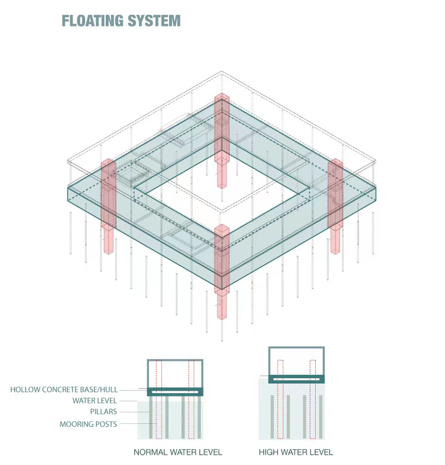 A squared donut structure that blends front and back, enabling free accessibility and flexibility in orienting and positioning, the architecture is fully embedded in the forest. An all-around panoramic circulation maximizes the view toward surrounding nature while man experiences the continuous space effortlessly. The central court pool with plantation frames a scene of tranquility and a sense of privacy, which elevates the functionality by synthesizing inside and outside. The elevation is totally openable, and, for the purpose of keeping out insects, is installed with pivot-sliding net panels. To cope with the tidal water levels, a floating system is applied in the architecture, which again defines our proposal as environmentally friendly and as a responsive manifesto toward climate change.