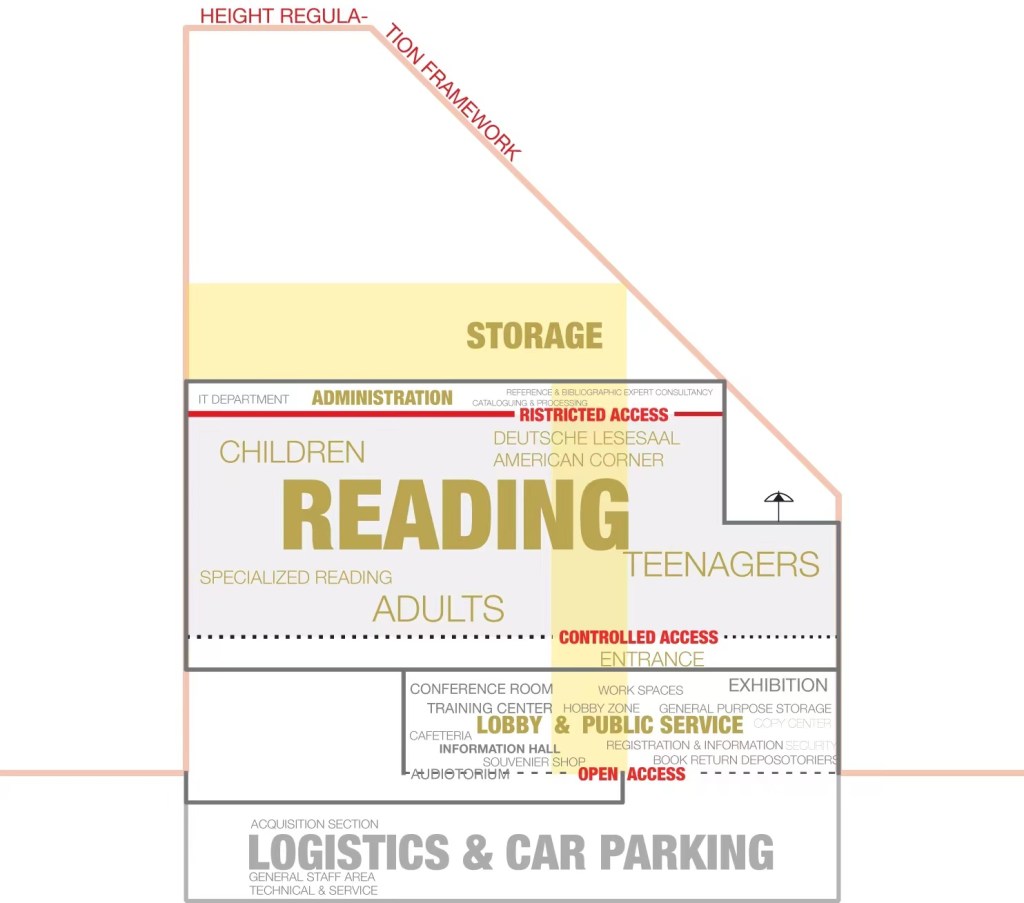 We tend to organize the functions in a vertical-linear format, with the street levels housed in with public services that free to access. efficiently between repository and the library reading levels which occupies the middle body of the building.