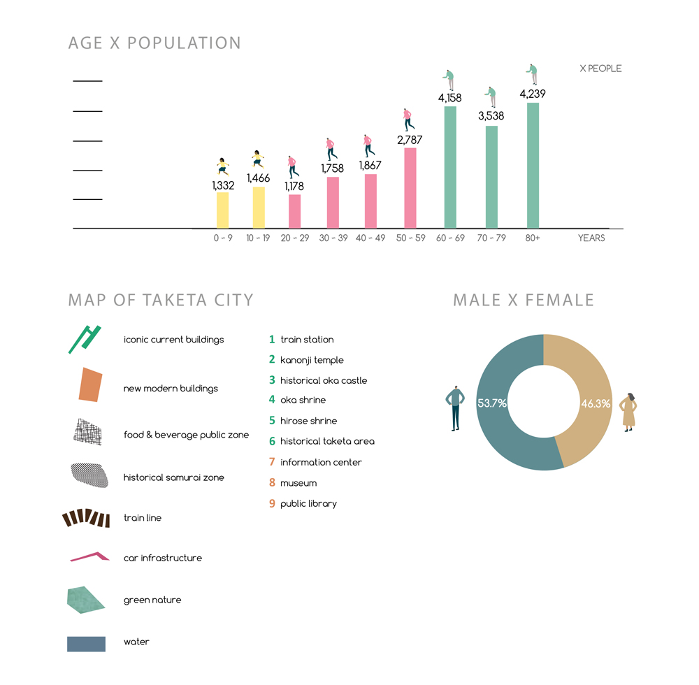 The municipality of Taketa is aware of the graying of its citizens. Approximately 50% of the population of Taketa is older than 60 years. Based on current numbers, within 10 to 30 years, the population will decrease drastically. Taketa is a castle city between green mountains and is well known for its history of the Nakagawa samurai clan. The Oka castle and some Nakagawa residents have remained in this city, which are tourist spots of this castle city.
