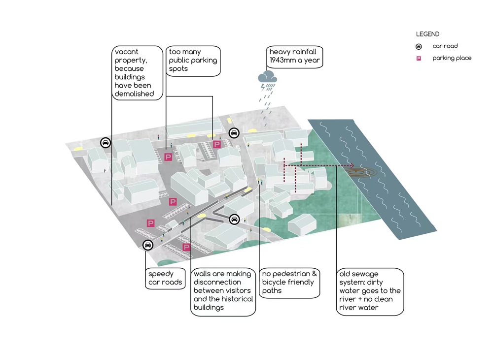 Taketa has a lot of existing urban weaknesses. The results of this workshop underscore the need to improve modern living conditions. These conditions affect the city’s attraction for young adults and families. The dirty water of each building doesn’t lead to a common sewage system in the ground, but shockingly it leads to the main river.
