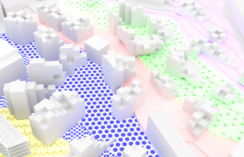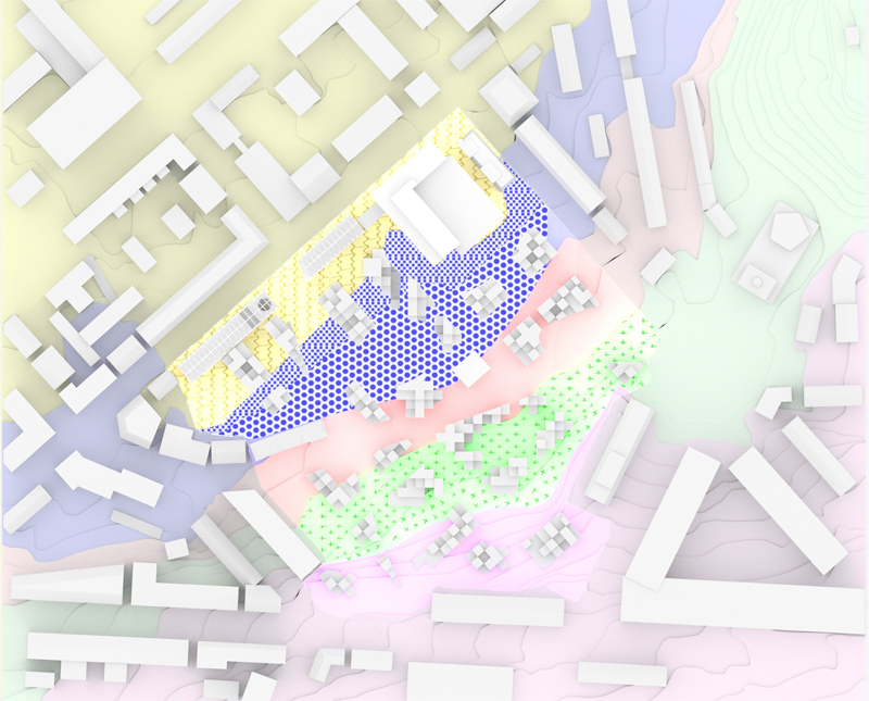 The site is organized as a singular rich landscape, open to the city on every side and connecting the communities surrounding it. Reversing the familiar plan of courtyard buildings, here the landscape surrounds the buildings, creating a productive landscape for the area – with urban farming, water conservation, commerce, education, and daily life integrated throughout the site.