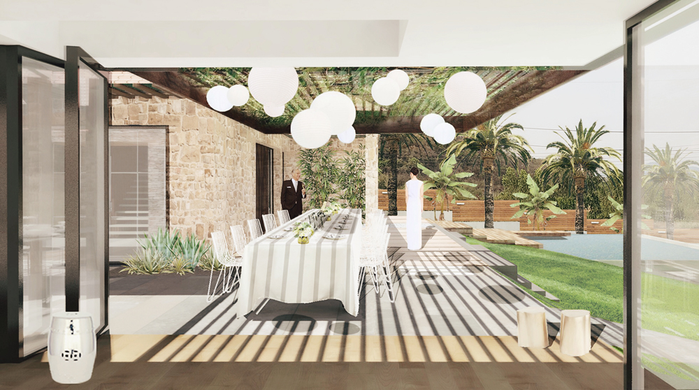 The principle to master plan the estate is to first set up a central axis, then to build up visual and spatial connections by introducing passage, opening, and pathway. The central axis is in the north-south direction, dividing the estate into two main zones with the east side private and the west side for the guests and home service. A pergola parking facility is positioned at the further corner of the estate in favor of maximizing the view from the main villa. Services are engaged more on the back side of the estate. In order that the back side is also utilized well, a barbeque garden and a traditional Thai gazebo garden are themed. In the central cross, point finds the main terrace where outdoor activities like dining and drinks usually take place. We bring in a cascading water feature and position it next to the master bedroom of the existing villa, catching immediate attention the moment one steps into the front garden. Linked by a terrace and a water lily pond, the pool is characterized as a zen-like object, endowed with an inserted platform where the owner or guest can practice a water Yoga session. The pool is accessible from both the main terrace and the pathway from the setback side. In an effort of providing a quality space for the meditation room in the extension, a zen-themed garden is added beside the extension and is freely approachable from inside the room and outside from the passage. The Zen garden is also visually connected to the main terrace.