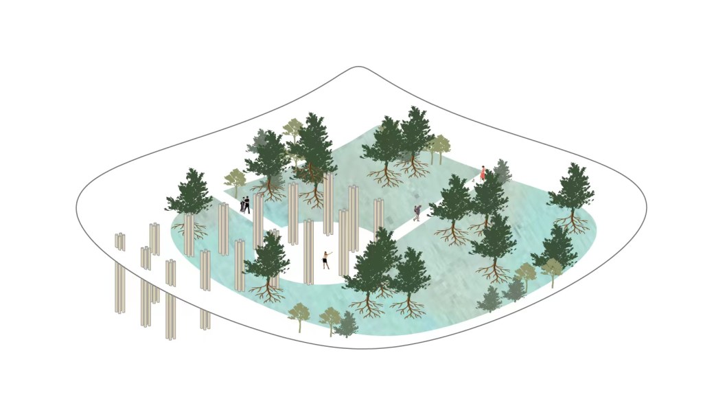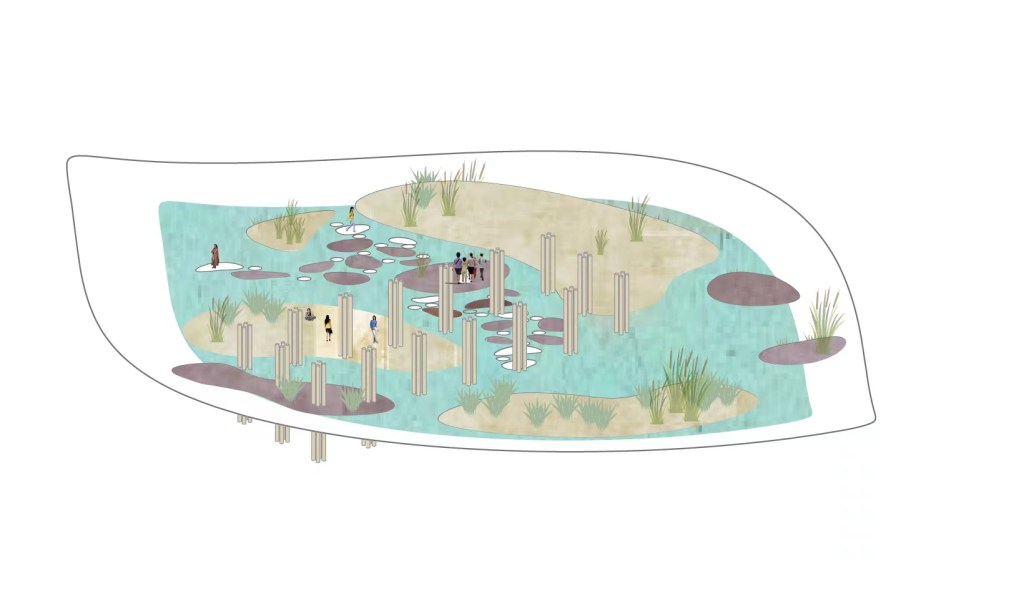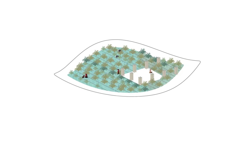 It is divided into 3 themes, which are related to Man x Nature x Technology. The Botanical garden with a water treatment system on the first floor, to provide to visitors with a green recreation, surrounded by water. The combination of green and water is crucial since the roots of the plants are the habitats of microorganisms, who clean the water by eating bacteria from the dirty water. The middle part is the Aquaponics section.