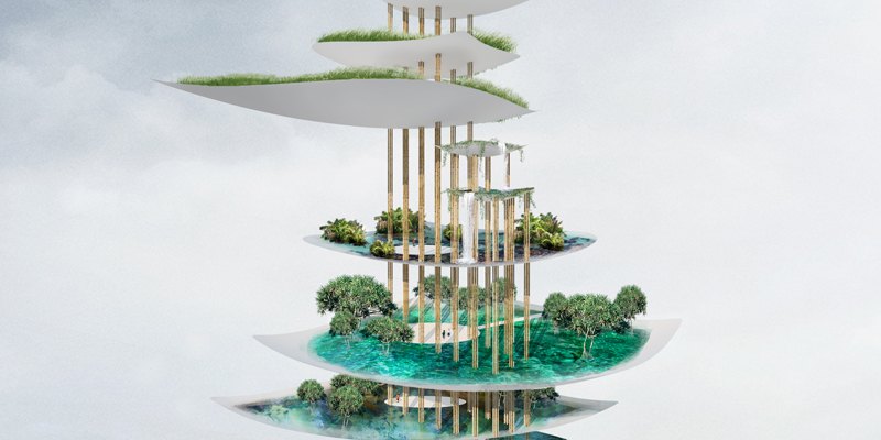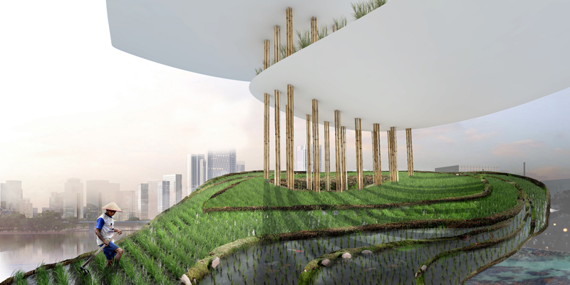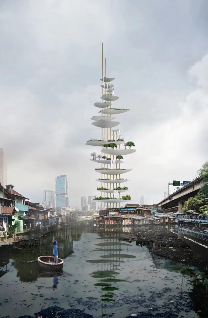This bamboo-structured skyscraper creates the antonym of the sinking city. It rises from the sinking city to bloom Jakarta into a sustainable condition with a clean water system.
