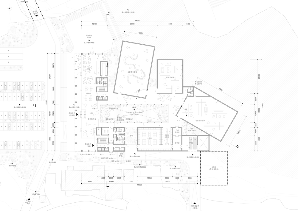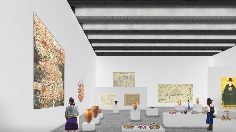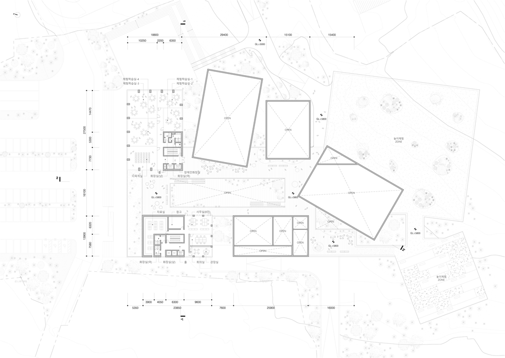 As a museum and lifelong educational facility that embraces young people, it will play a central role in the development of Yeongcheon’s identity. Yeongcheon Han’s village, which is on top of the hill, next to the museum’s side, is integrated with the idea to develop the identity of this city. Yeongcheon Han’s village and this museum is one whole cultural park. Therefore the accessibilities of between these two are important. The idea of village and small buildings is blended in the shape of the museum. The courtyard surrounded by the main masses and the roof terrace of the first floor create the experience of looking at the sky, which linked to the Bohyeonsan Observatory.